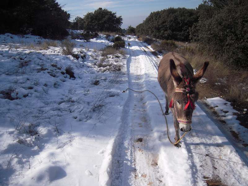 Luego estuvimos un rato caminando en silencio, supongo que Jesús imbuido en esos pensamientos de cortijos y cortijadas, y yo mirando y oliendo todo, descubriendo nuevos paisajes, y Moro y Pupy de aquí para allá, sobre todo Moro, hay que ver lo «salvaje» que es. Pupy es otra cosa y últimamente se pone detrás mía y sigue mis pasos…Y de repente, mi Arriero exclamó: «¡La nieve Sierrita, mira, mira!» A unos cuarenta pasos el camino se convertía en algo blanco…